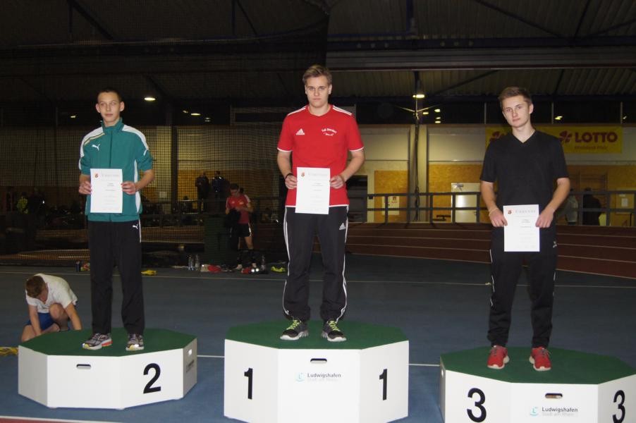 Luca Hoffmann gewinnt bei den Rheinland-Pfalz-Hallenmeisterschaften in Ludwighafen das Kugelstoßen der M U 16 mit starken 13,05 m.